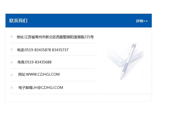 地址:常州市新北區友邦商務大廈1幢16、17層  電話:0519-85101652  傳真:0519-85112595  郵編:213022  網址:www.cz-jiayue_cn.matonghui.com  郵箱:xiajifengaa@163.com